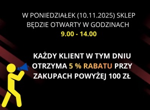 W poniedziałek jesteśmy otwarci od godziny 9.00 - 14.00 ODZIEWDŹ NAS I SKORZYSTAJ Z RABATU -5% PRZY ZAKUPACH ZA MIN. 100 ZŁ !